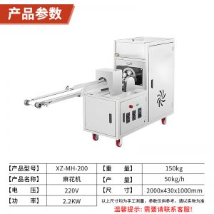 名稱XZ-MH-200麻花機 電源220/380V 功率2.2KW 產量40-60斤/小時 尺寸1970X500X1000mm 重量90KG 規格可調 其他