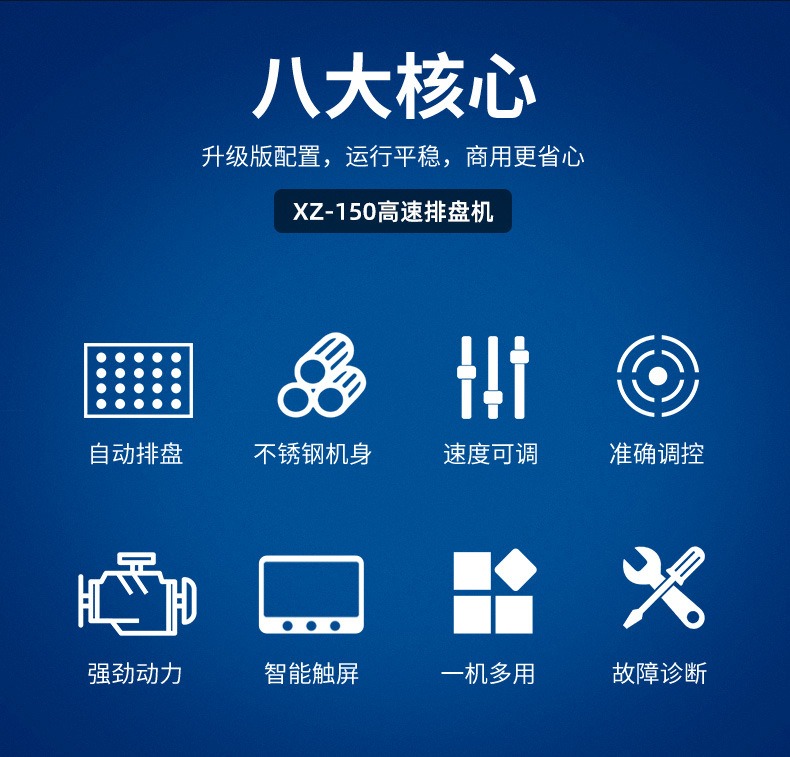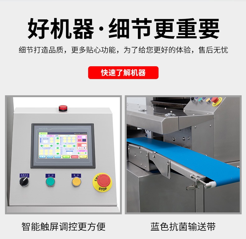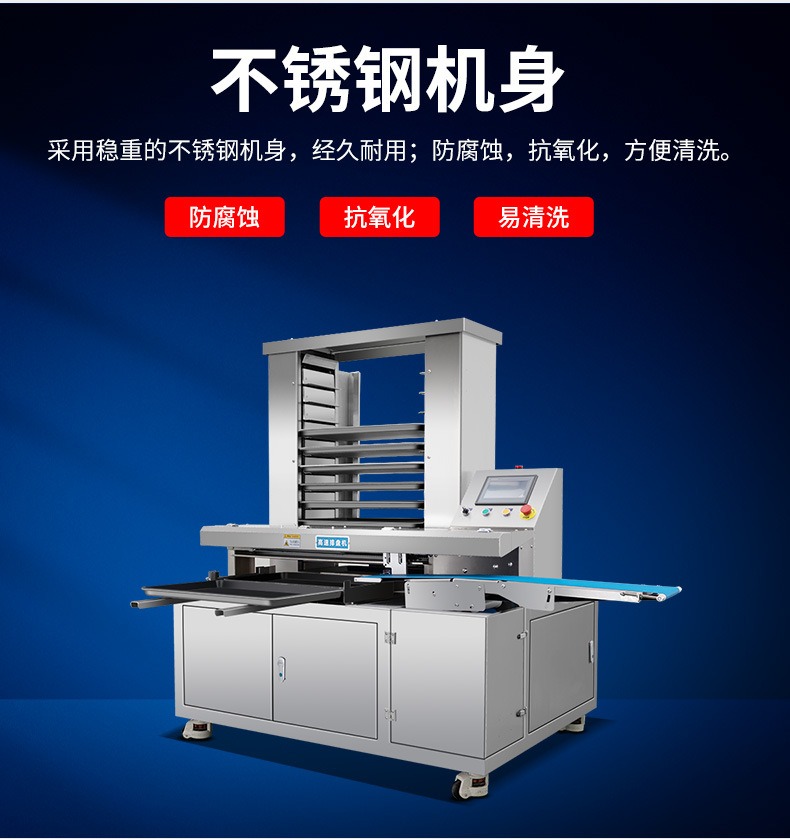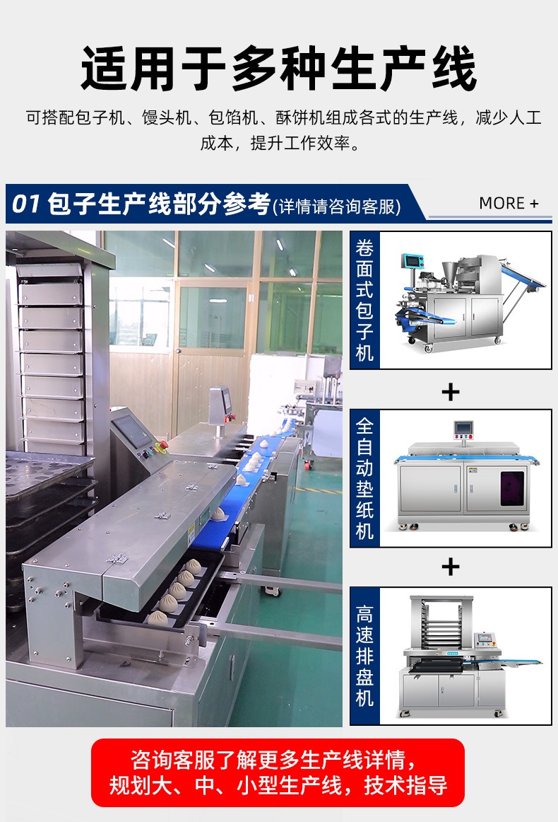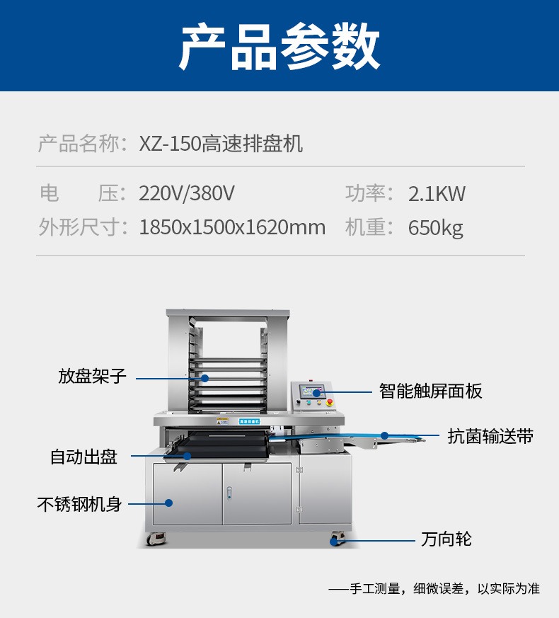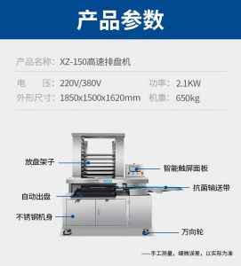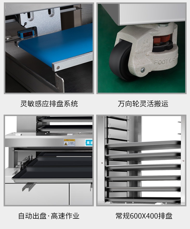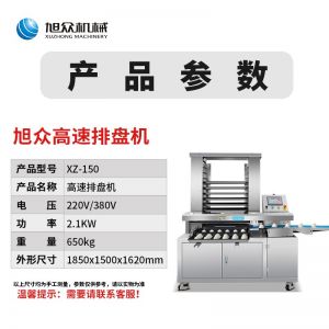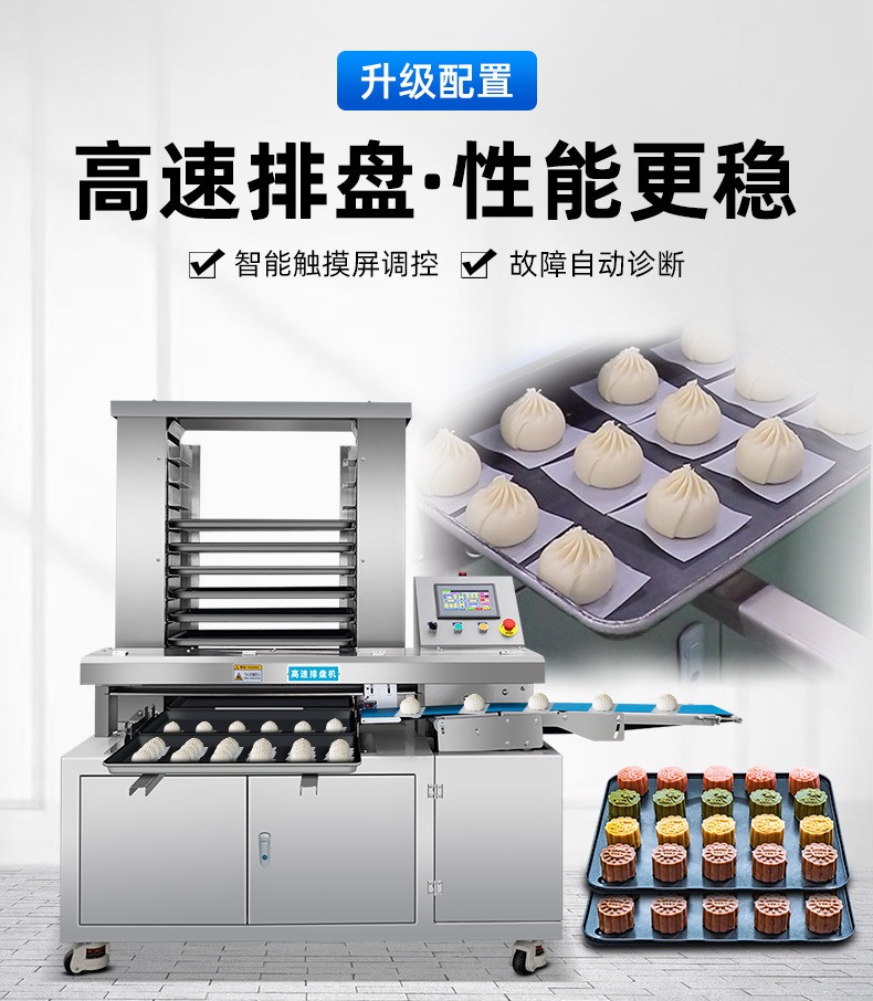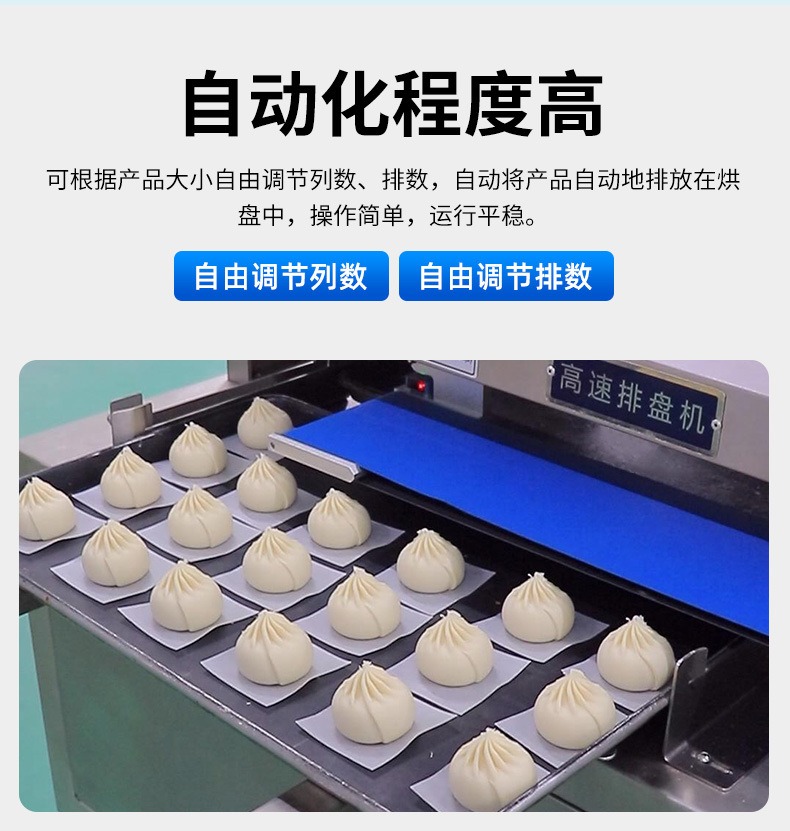 多功能商用高速排盤機,自動化程度高,可根據產品大小自由調節列數、排數,自動將產品自動地排放在烘盤中,操作簡單,運行平穩。智能觸屏麵板。控製係統由三菱PLC和進口觸摸屏組成,操作簡單方便。具有故障自動診斷,一目了然。
